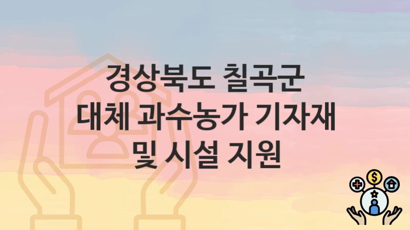 경상북도 칠곡군에서 시행하는 대체과수재배농업인에게 비가림시설, 관수관비시설, 선별기 등 기자재 및 시설 지원 정책을 안내해 드립니다.